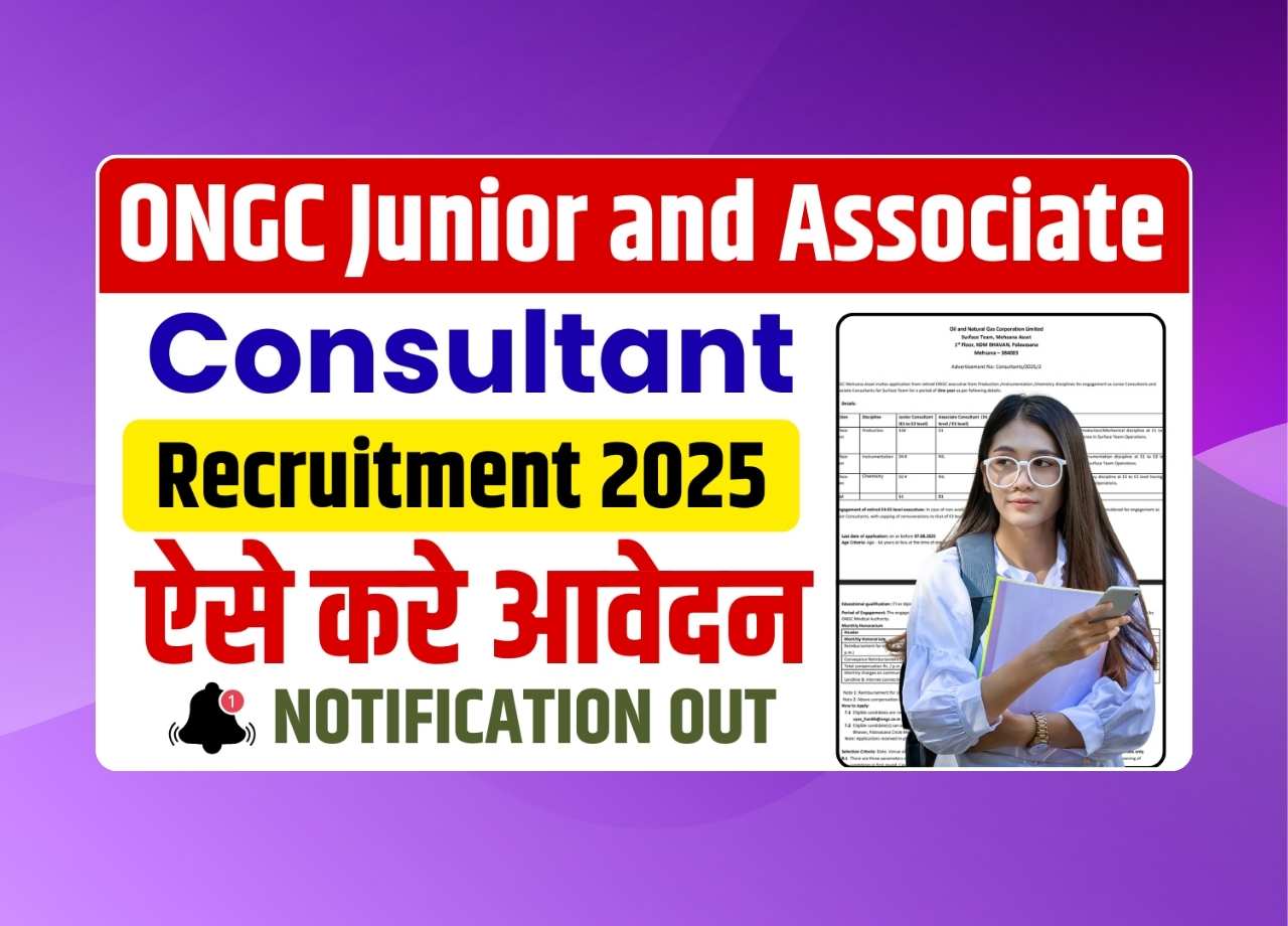 ONGC Junior and Associate Consultant Recruitment 2025:- ऑयल एंड नेचुरल गैस कॉर्पोरेशन लिमिटेड (ONGC) मेहसाना एसेट ने 17 जुलाई 2025 को जूनियर कंसल्टेंट और एसोसिएट कंसल्टेंट पदों पर भर्ती के लिए आधिकारिक नोटिफिकेशन जारी कर दिया है। इस भर्ती के तहत कुल 52 रिक्त पदों को भरा जाएगा, जिसमें 51 पद जूनियर कंसल्टेंट और 1 पद एसोसिएट कंसल्टेंट के लिए निर्धारित हैं। यह भर्ती विशेष रूप से ओएनजीसी से सेवानिवृत्त अधिकारियों के लिए आयोजित की जा रही है, जो प्रोडक्शन, इंस्ट्रूमेंटेशन और केमिस्ट्री विषयों में अपने अनुभव के आधार पर इस पद के लिए आवेदन कर सकते हैं।
