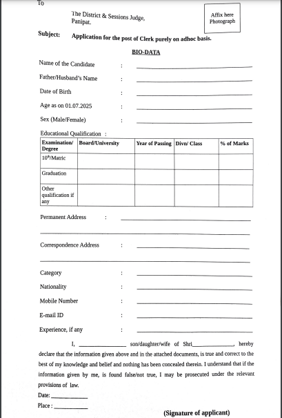 Sessions Judge, Judicial Court Complex, District Courts, G.T. Road, Panipat -132102 के पते पर 31 जुलाई, 2025 की शाम 05 बजे तक जमा करना होगा आदि।
