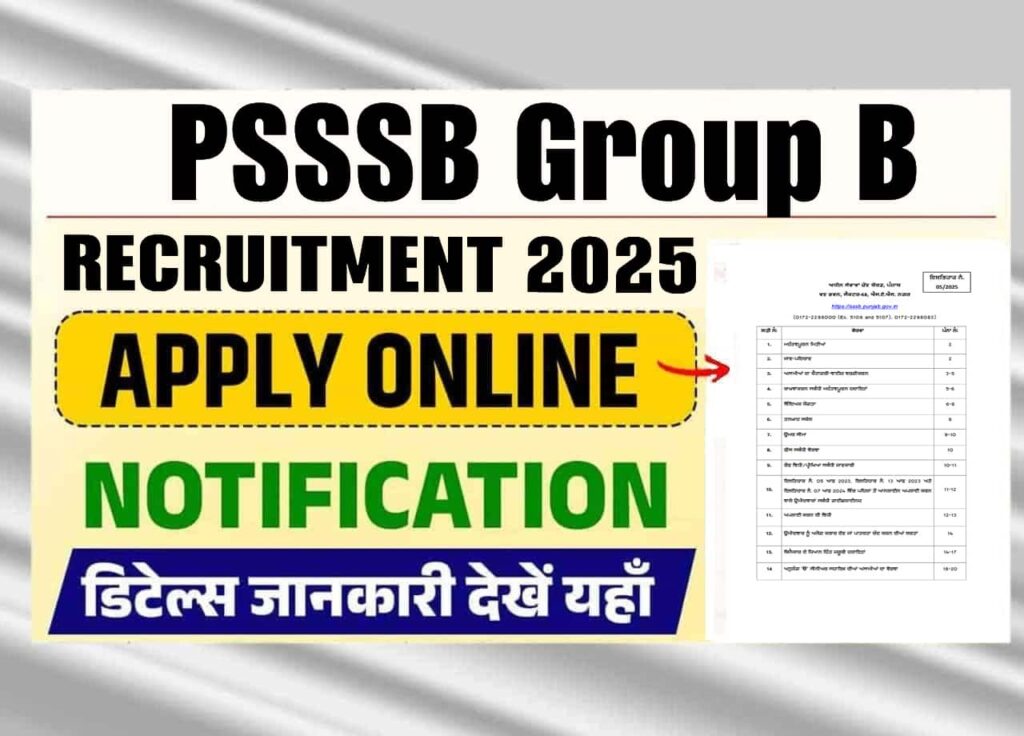 PSSSB Group B Recruitment 2025: क्या आप पंजाब अधीनस्थ सेवा चयन बोर्ड के तहत ग्रुप बी के विभिन्न पदों पर सरकारी नौकरी प्राप्त करना चाहते है यदि हां तो आफके लिए अच्छी खबर है कि, Punjab Subordinate Services Selection Board (PSSSB) द्धारा 18 जुलाई, 2025 को ग्रुप बी के विभिन्न पदों पर नया भर्ती नोटिफिकेशन जारी किया गया है जो कि, आपके लिए नौकरी पाने के बेहतर अवसर साबित हो सकता है और इसीलिए आपको लेख मे PSSSB Group B Recruitment 2025 की जानकारी प्रदान की जाएगी।