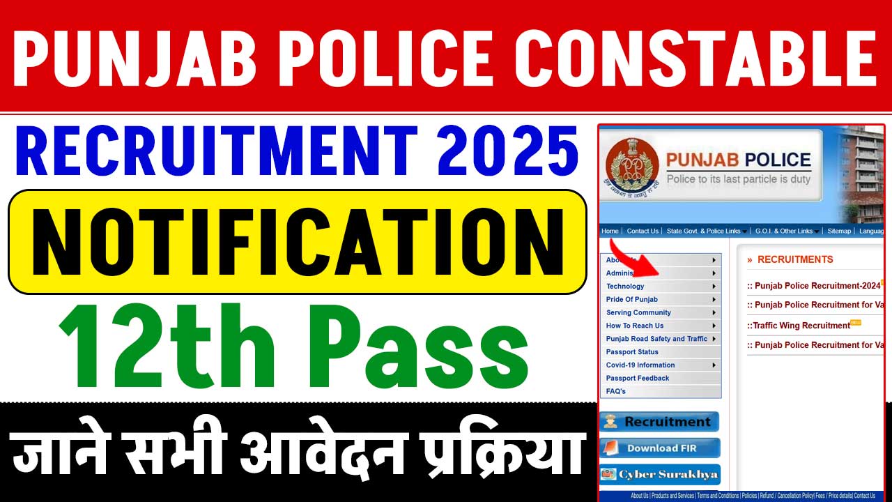 Punjab Police Constable Recruitment 2025: पंजाब में पुलिस कांस्टेबल के पदों पर भर्ती हेतु पंजाब पुलिस द्धारा Notification को जारी कर दिया गया है जिसके तहत पंजाब पुलिस कॉन्स्टेबल के रिक्त कुल 1,746 पदों पर भर्ती ली जाएगी। जितने भी इच्छुक व योग्य अभ्यर्थी इसके लिए आवेदन करना चाहते है तथा इस भर्ती से सम्बंधित सभी जानकारी विस्तारपुर्वक प्राप्त करना चाहते है तो इस आर्टिकल को पूरा जरुर पढ़ें। व्यक्ति 21 फरवरी 2025 से 13 मार्च 2025 तक पंजाब पुलिस कांस्टेबल रिक्तियों के लिए आवेदन करना शुरू कर सकते हैं।