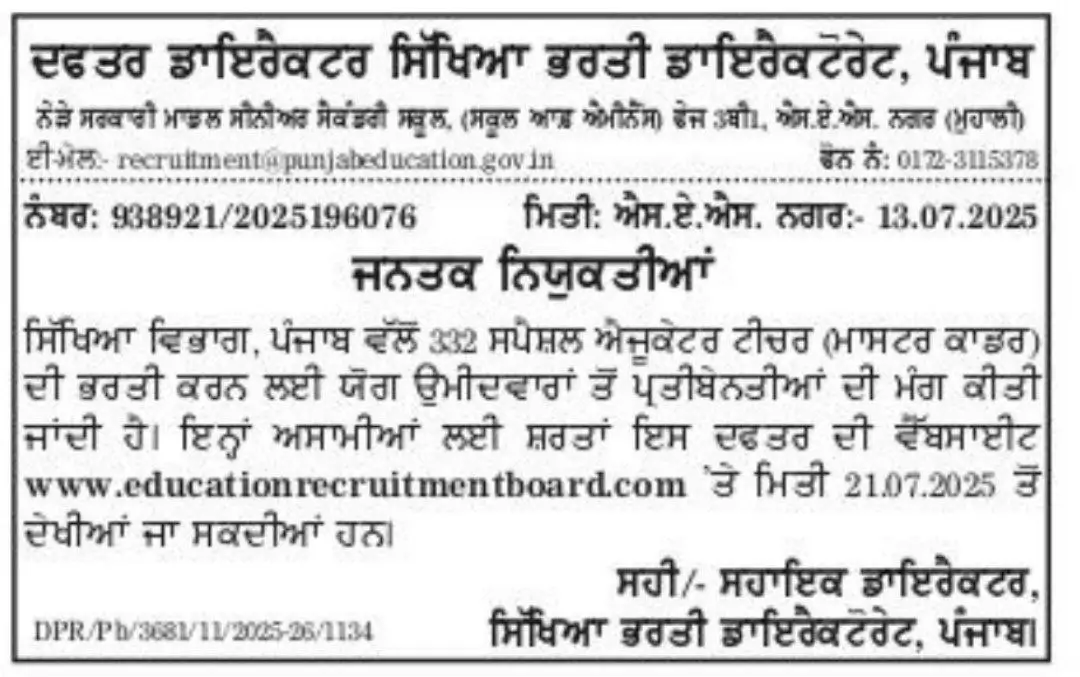 पंजाब शिक्षा विभाग द्वारा विशेष शिक्षा अध्यापक (स्पेशल एजुकेटर) की भर्ती के लिए 13 जुलाई 2025 को दो शॉर्ट नोटिफ़िकेशन जारी किए हैं। जिनके माध्यम से पंजाब शिक्षा विभाग द्वारा शिक्षकों के कुल 725 रिक्त पदों को भरा जाएगा। पंजाब सरकार द्वारा अभी फिलहाल यह नोटिफ़िकेशन रोजगार समाचार पत्र के माध्यम से प्रकाशित किया गया है, जिसमें बताया गया है कि 393 पदों पर प्राथमिक शिक्षक (PRT) और 332 पदों पर प्रशिक्षित स्नातक शिक्षक (TGT) की भर्ती की जाएगी।