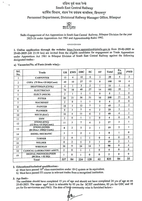 Railway SECR Apprentice 2025 – रेलवे में अप्रेंटिशिप के 835 पदों पे भर्ती का पूरा विवरण, Tarde-Wise Vacancy List