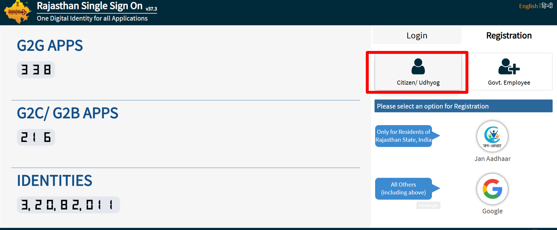 - अब आपको रजिस्ट्रेशन करने के लिए दो ऑप्शन मिलेंगे पहला Jan Aadhar का और दूसरा Google का।