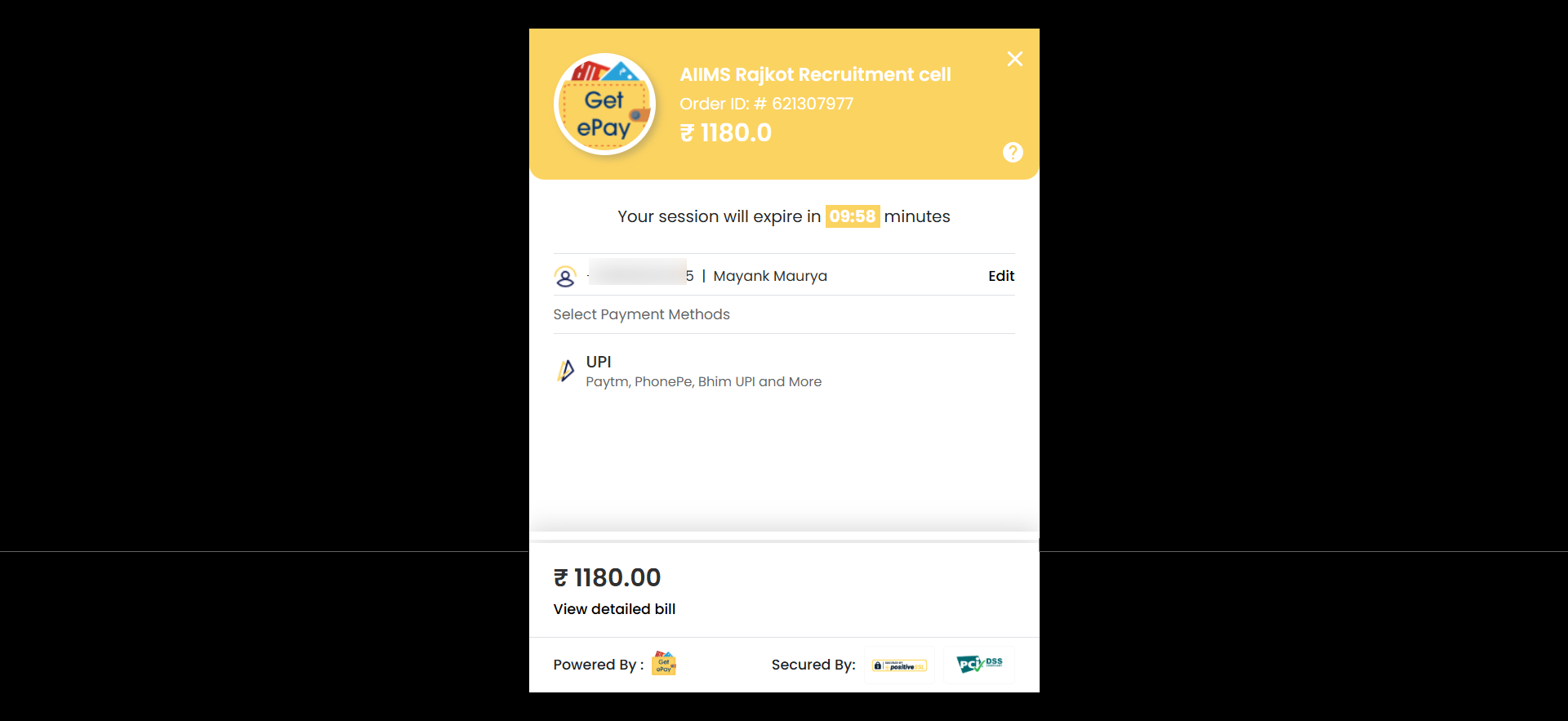 - जिसके बाद आपके सामने कुछ इस तरह का पेमेंट गेटवे खुलकर आएगा यहाँ पर आपको अपने आवेदन शुल्क का भुगतान करके AIIMS Rajkot Recruitment cell Transaction No. नोट करके रख लेना है जिसकी जरूरत आपको अपना आवेदन फॉर्म भरते समय पड़ेगी।