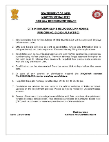 परीक्षा शहर, तिथि और SC/ST उम्मीदवारों के लिए यात्रा पास – परीक्षा से 10 दिन पहले RRB की आधिकारिक वेबसाइट पर उपलब्ध होगा।