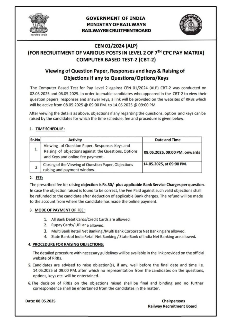 RRB ALP CBT 2 उत्तर कुंजी पर आपत्ति दर्ज करने के लिए शुल्क देना होगा?