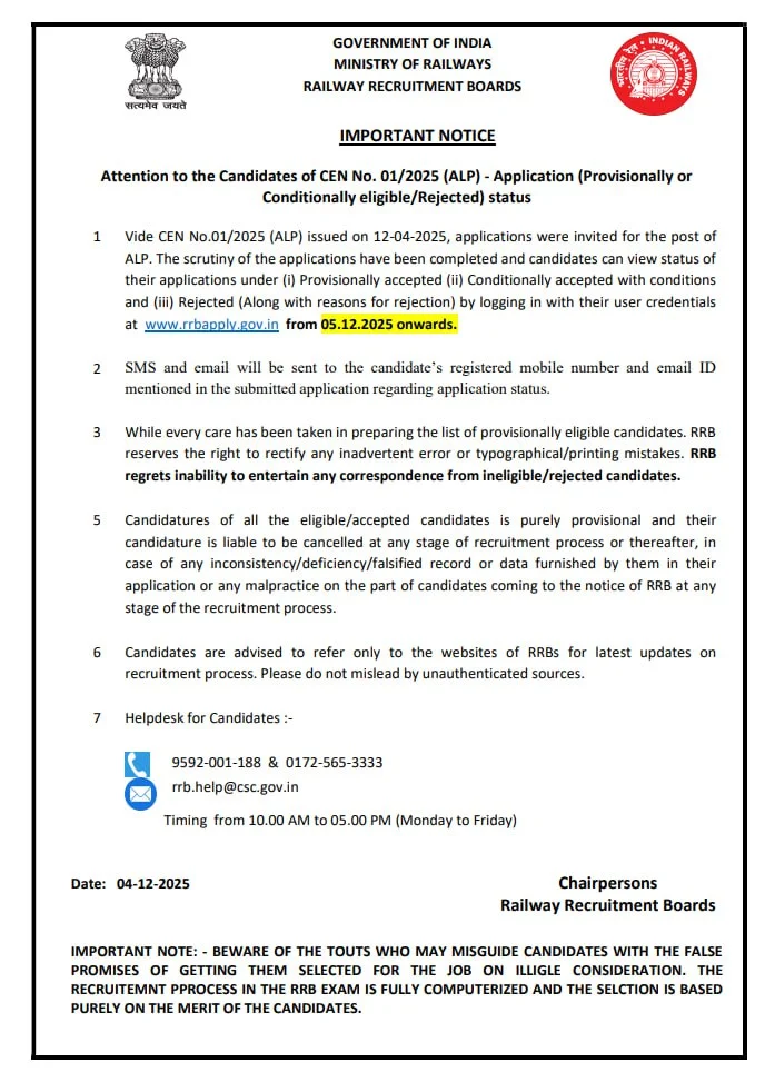 RRB ALP Recruitment Status Notice Out: अगर आपने भी RRB ALP Recruitment 2025 के तहत सहायक लोको पायलट (ALP) के पदों के लिए आवेदन किया है और अब आपने एप्लीकेशन फॉर्म का स्टेटस चेक करना चाहते हैं, तो इसके लिए एक इम्पोर्टेन्ट अपडेट आ गई है। आपको बता दें कि Railway Recruitment Board (RRB) ने आज यानी 4 दिसंबर 2025 को CEN No. 01/2025 (ALP) के लिए एप्लीकेशन स्टेटस का नोटिस जारी किया है। इस नोटिस के अनुसार जिन भी उम्मीदवारों ने आवेदन किया है, उनके आवेदनों की जाँच (Scrutiny) हो गई है। और अब सभी उम्मीदवार अपना एप्लीकेशन का स्टेटस चेक कर सकते हैं।
