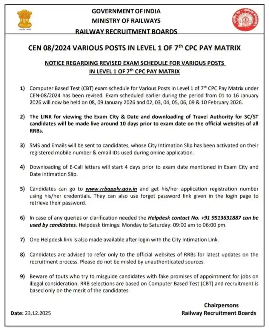 उम्मीदवारों को सलाह दी जाती है कि वे अपने एडमिट कार्ड पर दी गई सभी जानकारियों को ध्यानपूर्वक जांच लें और किसी भी त्रुटि की स्थिति में तुरंत अपने क्षेत्रीय RRB कार्यालय से संपर्क करें।