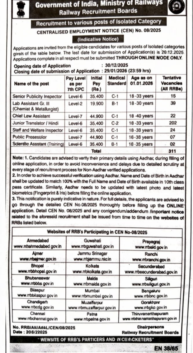 RRB Isolated Category Recruitment 2026: Railway Recruitment Board (RRB) ने Isolated Category पदों पर भर्ती के लिए आधिकारिक शॉर्ट नोटिस जारी कर दिया है। यह भर्ती CEN No. 08/2025 के अंतर्गत आयोजित की जा रही है। इस भर्ती अभियान के माध्यम से भारतीय रेलवे के विभिन्न जोन और यूनिट्स में कुल 311 पदों पर नियमित नियुक्ति की जाएगी।