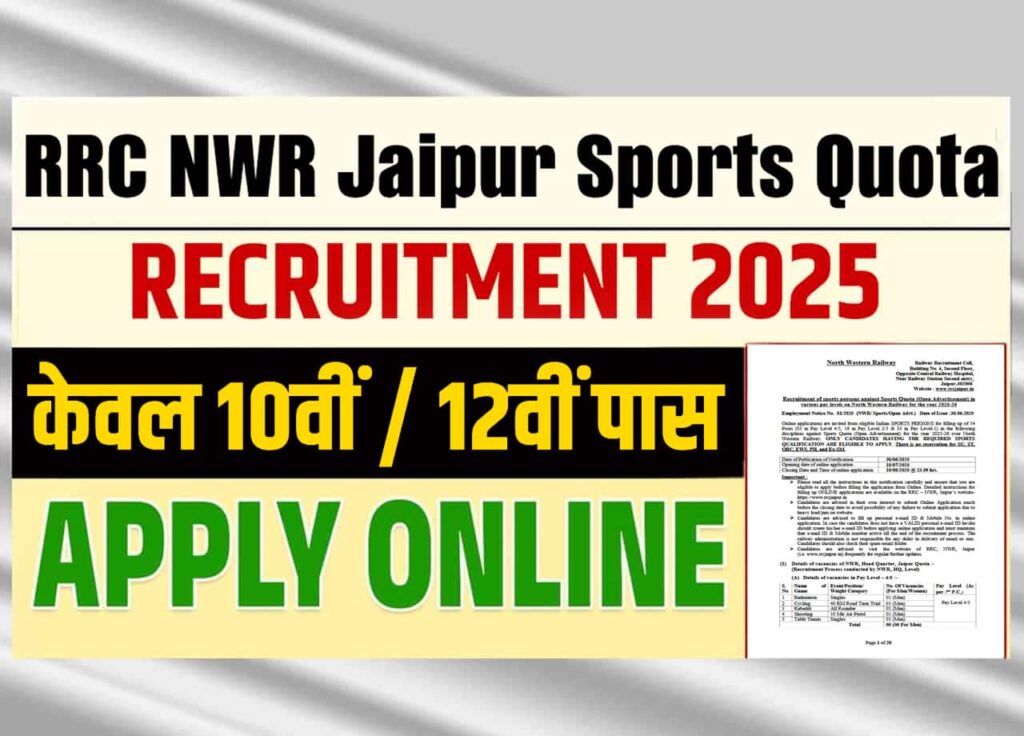 RRC NWR Jaipur Sports Quota Recruitment 2025: यदि आप भी 10वीं या फिर 12वीं पास और स्पोर्ट्स कोटा के तहत रेलवे मे सरकारी नौकरी प्राप्त करना चाहते है तो आपके लिए North Western Railway, Railway Recruitment Cell द्धारा Recruitment of sports persons against Sports Quota (Open Advertisement) को जारी किया है जो कि, आपके लिए स्पोर्ट्स कोटा के तहत नौकरी पाने का सुनहरा अवसर साबित हो सकता है औऱ इसीलिए आपको इस आर्टिकल मे विस्तार से RRC NWR Jaipur Sports Quota Recruitment 2025 की जानकारी प्रदान की जाएगी।