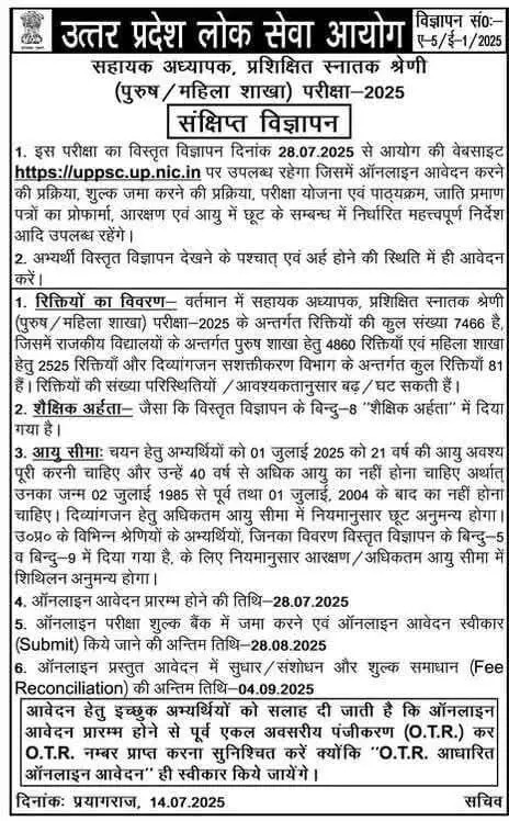 UP LT Grade Teacher Recruitment 2025:- उत्तर प्रदेश लोक सेवा आयोग (UPPSC) ने सरकारी शिक्षक की नौकरी की चाह रखने वाले उम्मीदवारों को एक सुनहरा अवसर प्रदान करने के लिए 15 जुलाई 2025 को एक शॉर्ट नोटिफ़िकेशन जारी किया है। भर्ती के इस शॉर्ट नोटिफ़िकेशन में कुल कुल 7466 पदों पर भर्ती करने की घोषणा की गई है। जिसमें पुरुष उम्मीदवारों के लिए 4860 पद, महिला उम्मीदवारों के लिए 2525 पद और दिव्यांगजन के लिए 81 पद निर्धारित किए गए हैं।