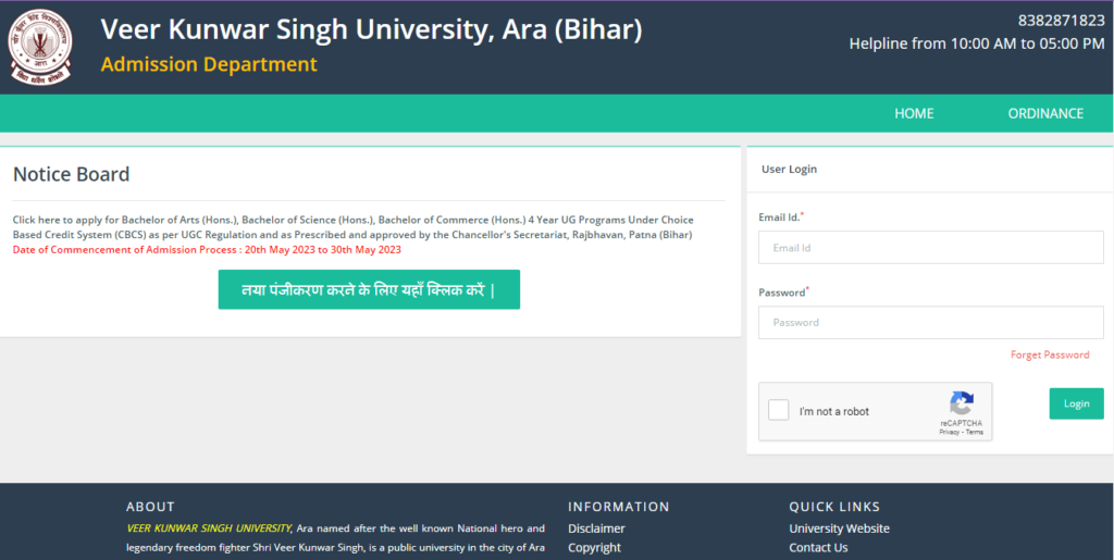 वीर कुंवर सिंह विश्वविद्यालय द्वारा स्नातक कोर्स (B.A, B.Sc & B.Com) शैक्षणिक सत्र 2025-29 में दाखिला के लिए पोर्टल को लाइव किया कर दिया गया हैं। यूनिवर्सिटी की माने तो, 30 मई से ऑनलाइन नामांकन की प्रकिया शुरू होगी। वहीं अंतिम तिथि 08 जून 2025 हैं।
